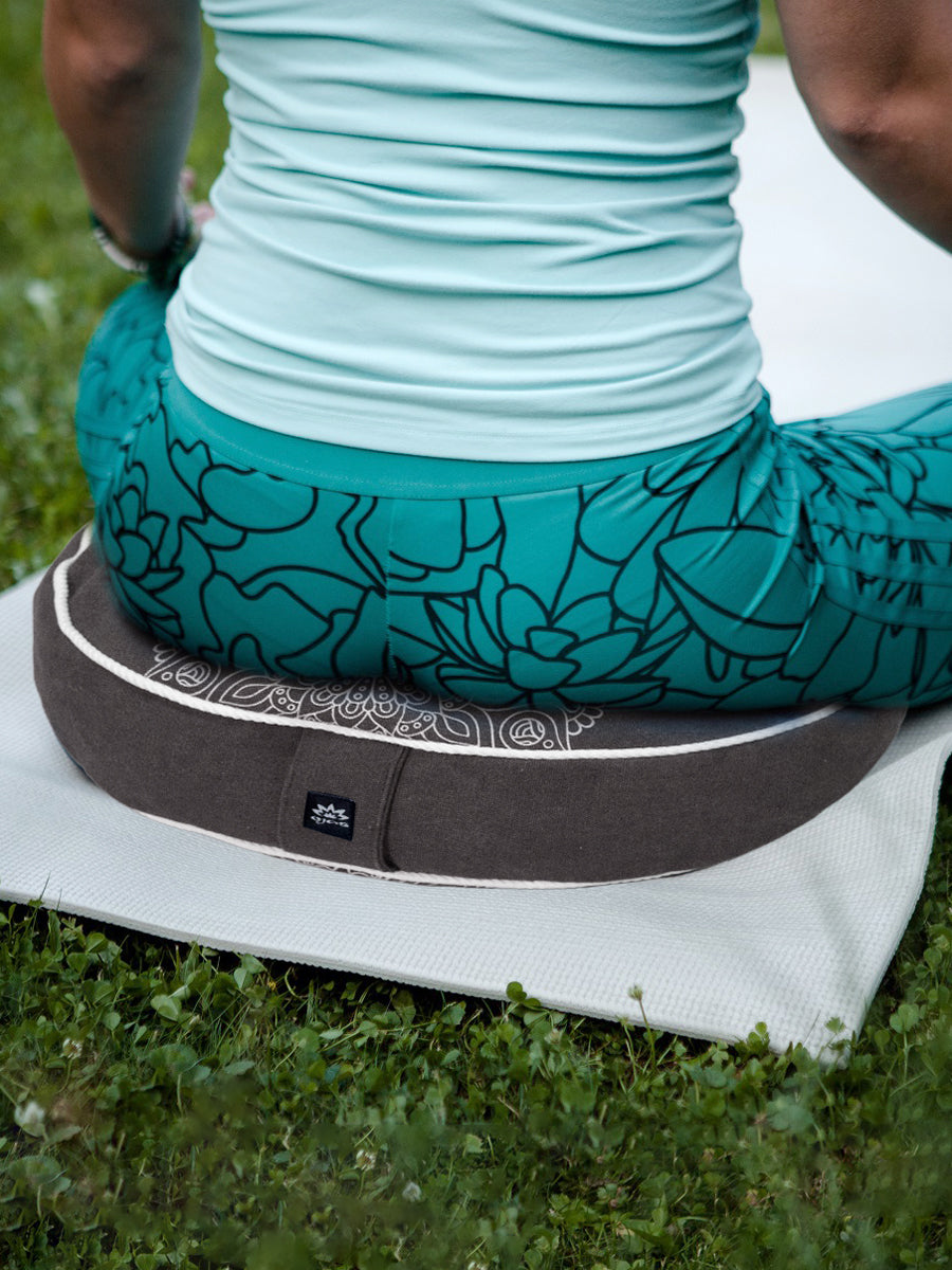 The Crescent Meditation Cushion provides ergonomic support for cross-legged and seated yoga poses, promoting proper spinal alignment. Filled with natural buckwheat hulls and covered in soft, removable cotton, it offers comfort, stability, and easy portability.