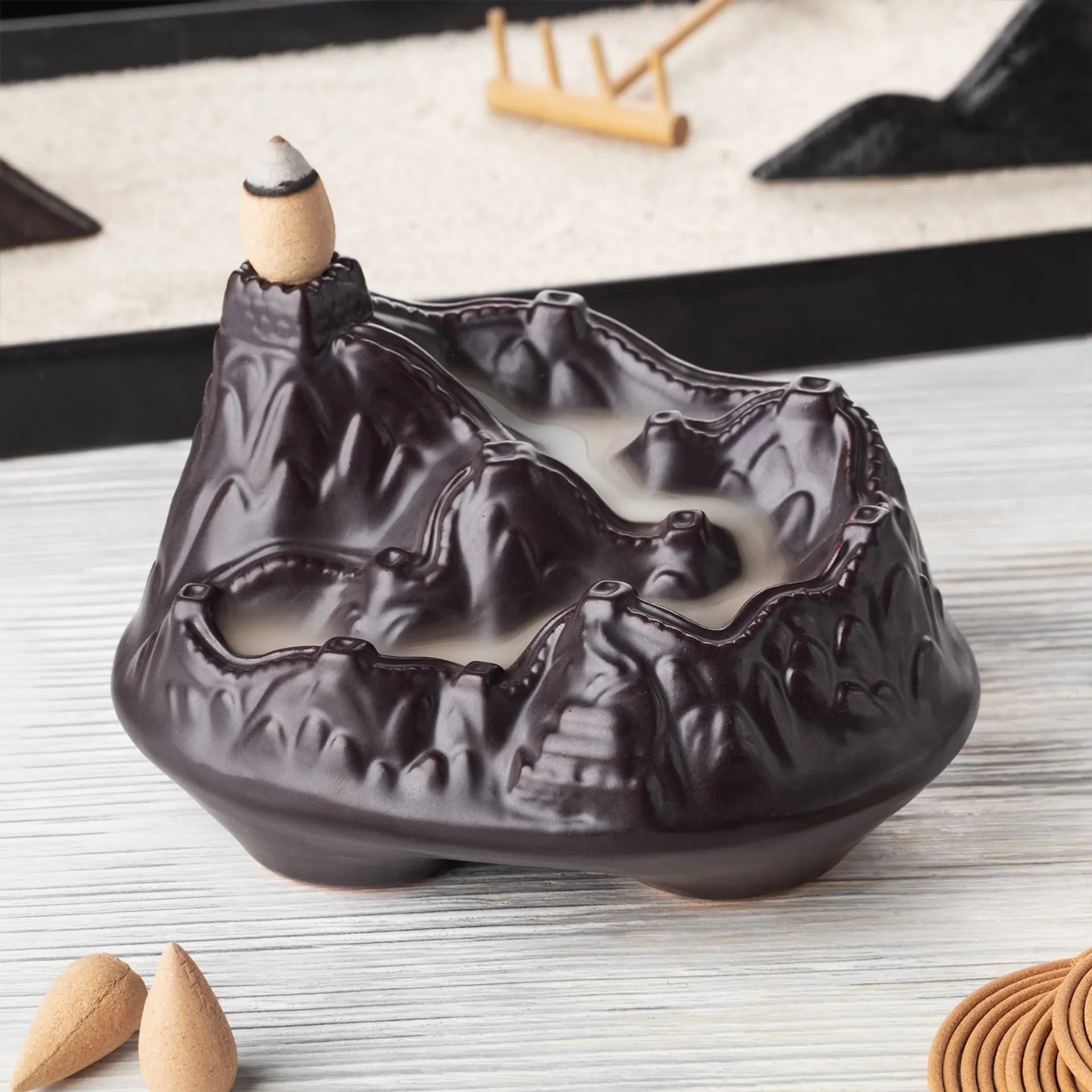 Place a backflow incense cone on the designated tower, light it, and watch the smoke flow gently down the mountains. Ensure the area is free from drafts to maintain the cascading effect.