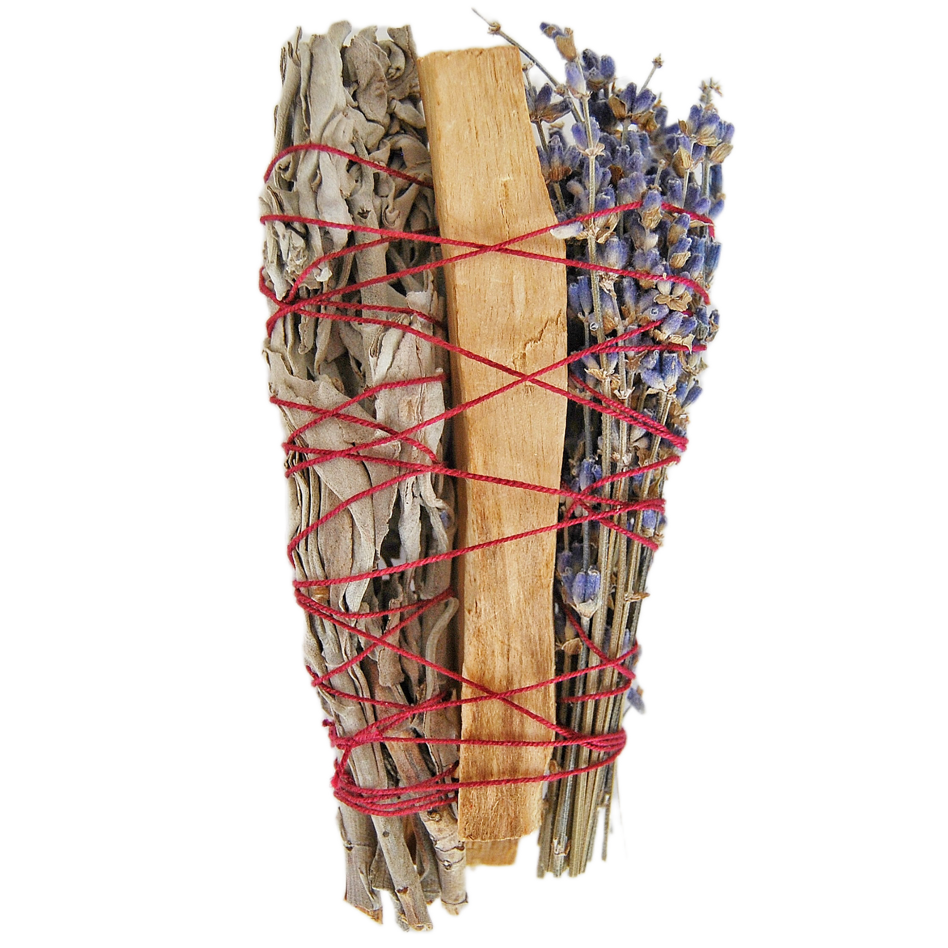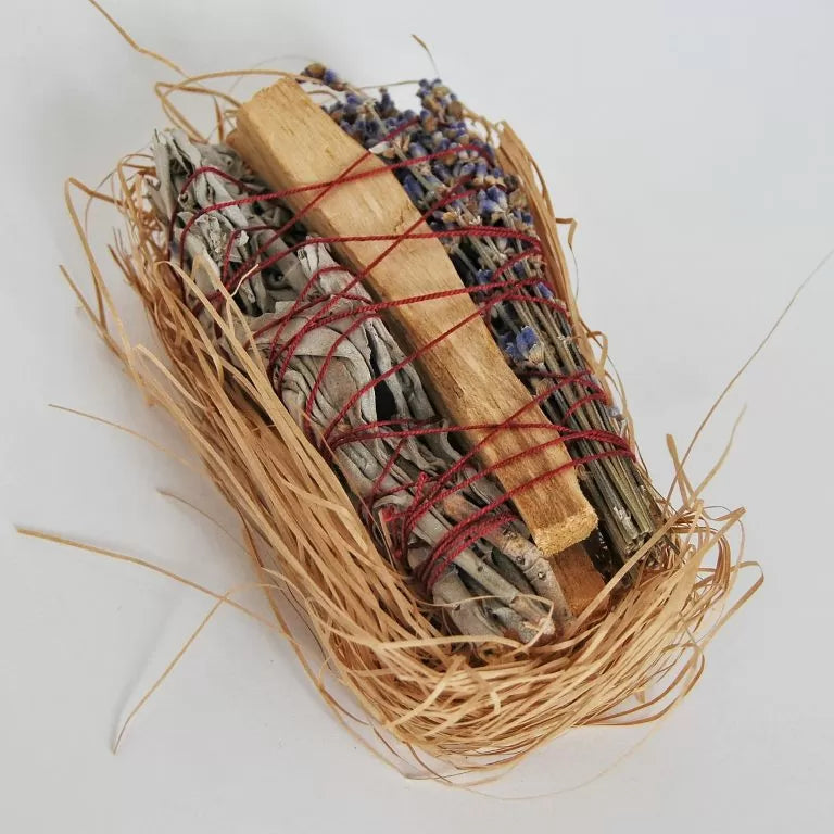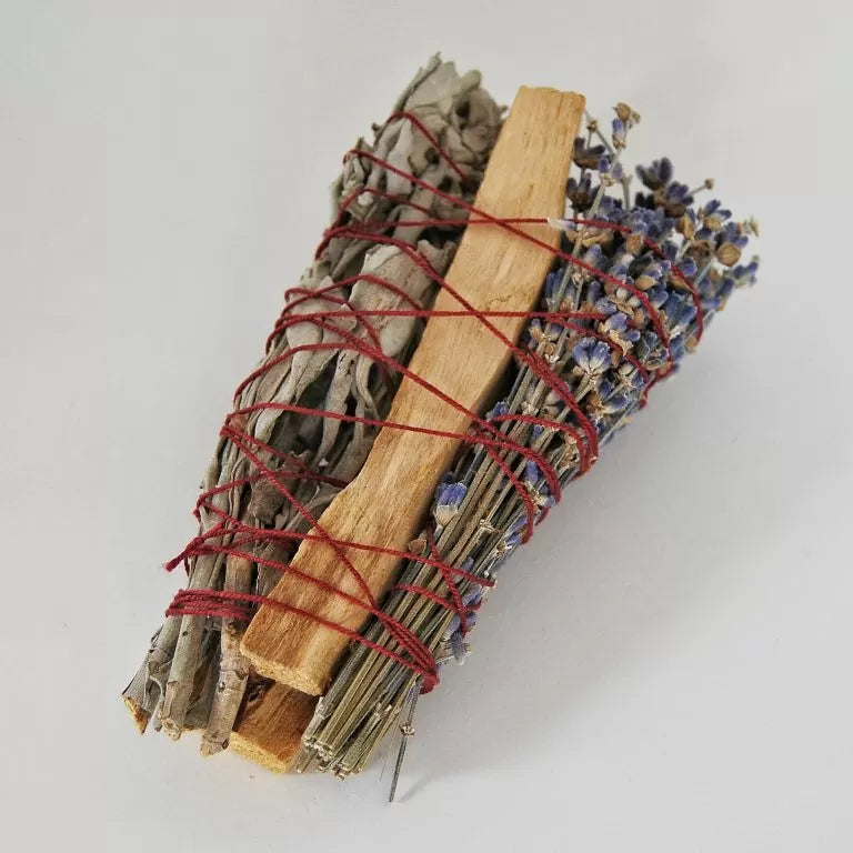 The woody aroma of Palo Santo, the soothing floral scent of lavender, and the purifying smoke of White Sage work together to neutralize negative energy, calm the mind, and promote a sense of balance and harmony in your home or sacred space.